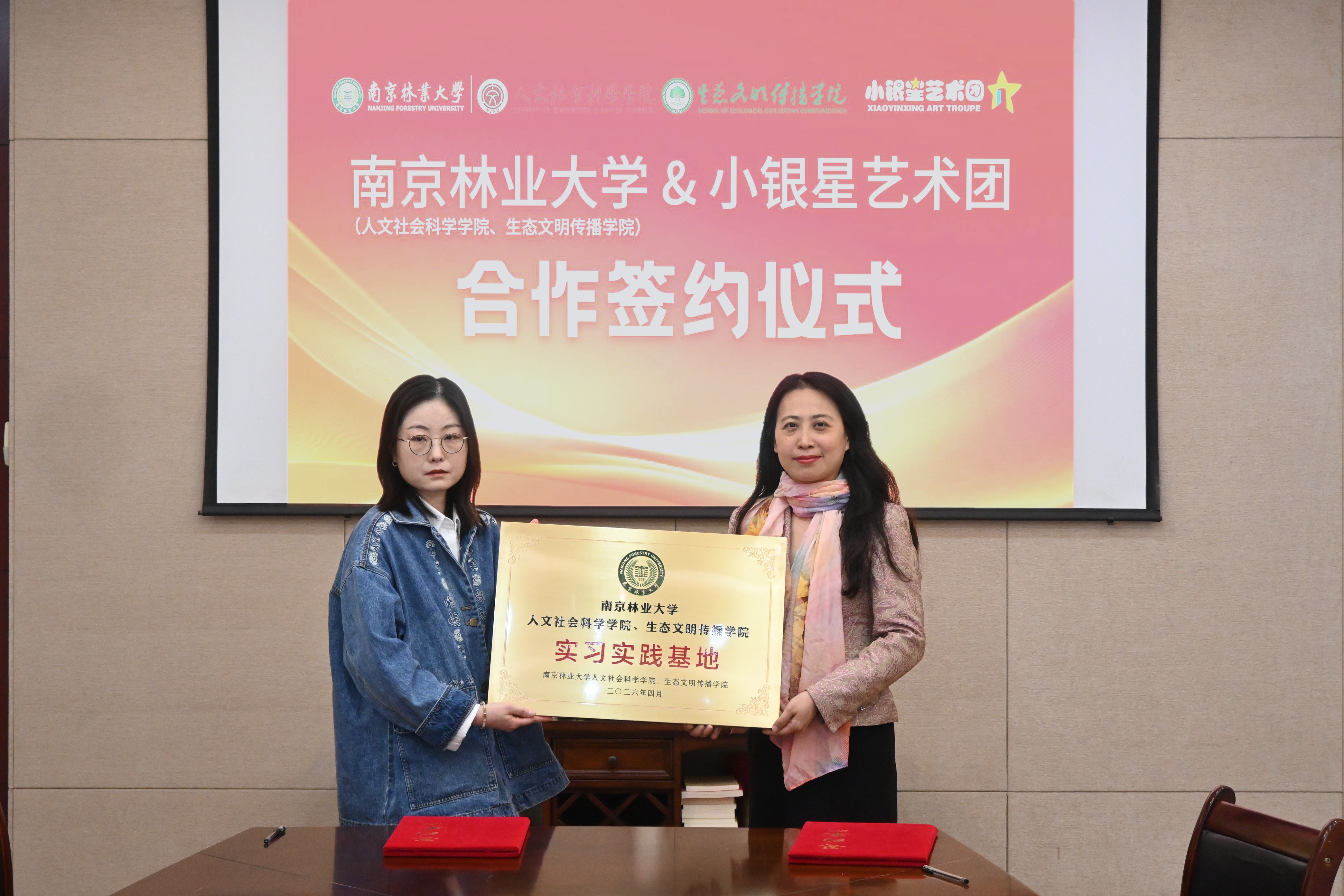 交流结束后,双方正式签署实习实践基地合作协议,并举行授牌仪式。王瑾代表学院向南京小银星艺术团授予“实习实践基地”牌匾,标志着双方共建实习实践基地工作正式启动。